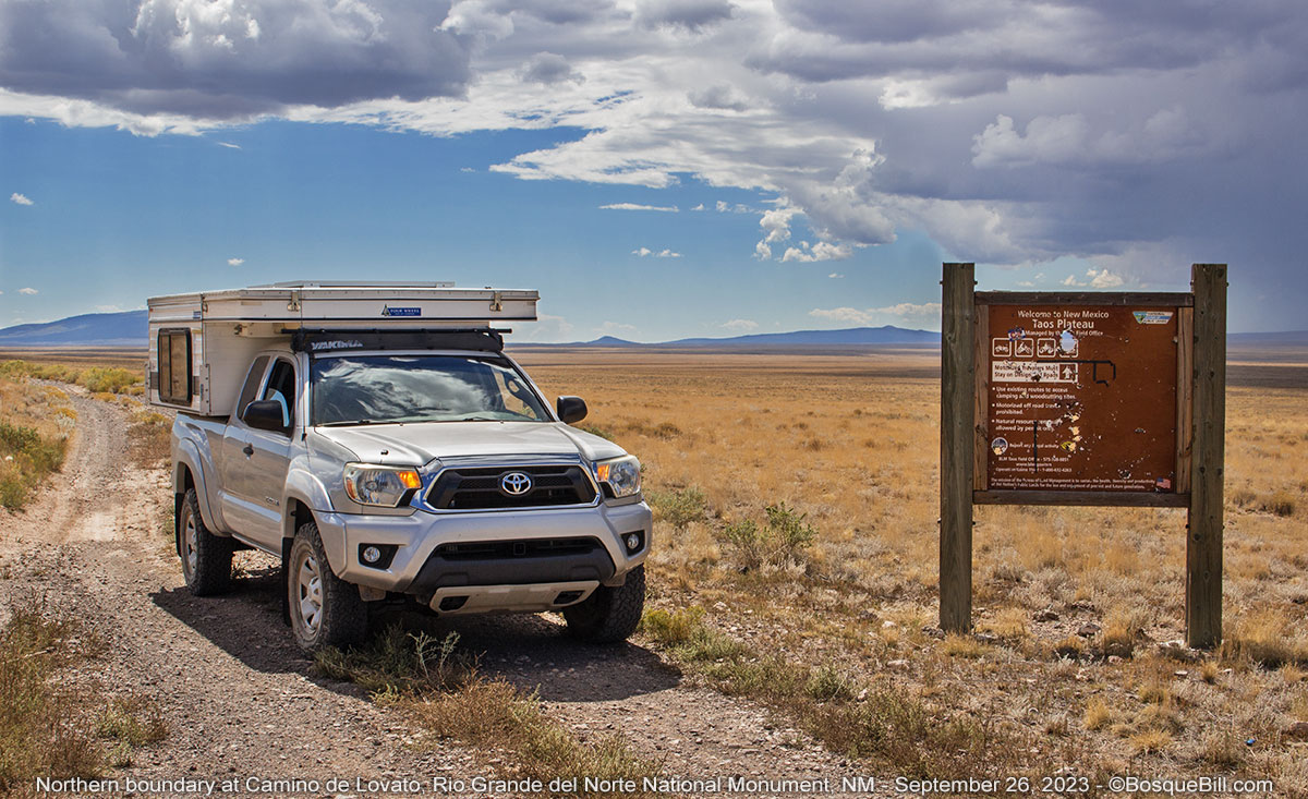The entrance road is marked with an old-style BLM sign that is modern enough to include the legend Rio Grande del Norte National Monument and has their map under plexiglass. The road goes straight south for two miles and is smooth and wide. It then turns straight west. It gets somewhat more confusing after that and I was keeping my eyes on the weather as the clouds were building.